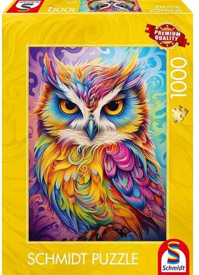 A Schmidt puzzle kiváló minőségű, német gyártmányú kirakó. A speciális matt lakk felhasználás következtében a kirakók fényvisszaverődés nélkül tárják elénk a szebbnél szebb képeket. A Schmidt 1000 db-os puzzle - Owl in parrot dress című kép egy színes baglyot ábrázol, mintha papagájnak öltözött volna.