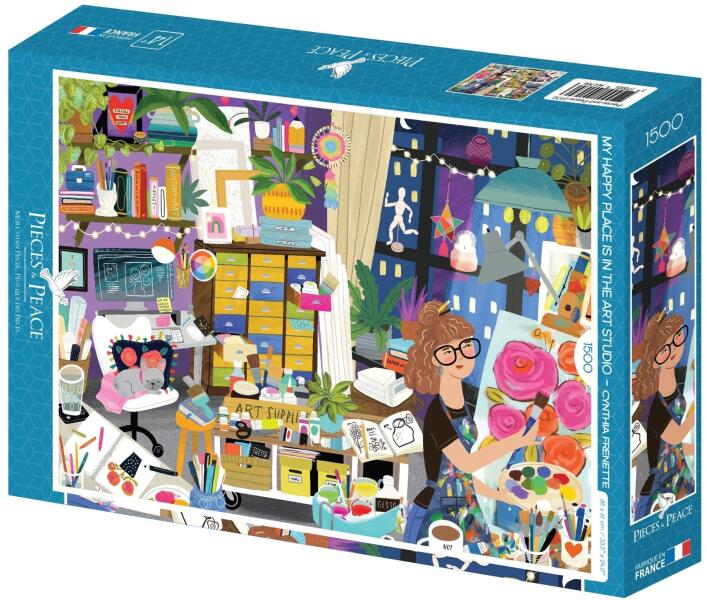 1500 darabos kirakó . Márka: Pieces & Peace Művész: Cynthia Frenette Kirakott kép méret: 85 x 61 cm Doboz méret: 35,5 x 24 x 5,5 cm Eredeti cím: My Happy Place is in the Art Studio GTIN: 3770001401706