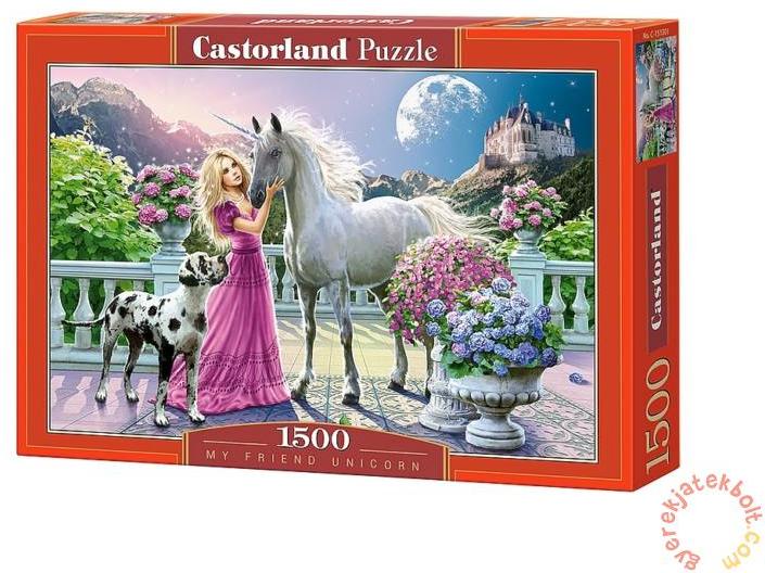 A szőke hajzuhataggal megáldott hercegnő hű társa, kutyája mellett különleges barátságot ápol egy szépséges, hófehér unikornissal. A varázslatos lény minden este holdtöltekor meglátogatja a bájos leányzót, aki egy hegyekkel körülvett királyságban él. Az akvarell festmény hatású puzzle-t 1500 darabból illesztheted össze egy kis ügyességgel, melybe a család minden