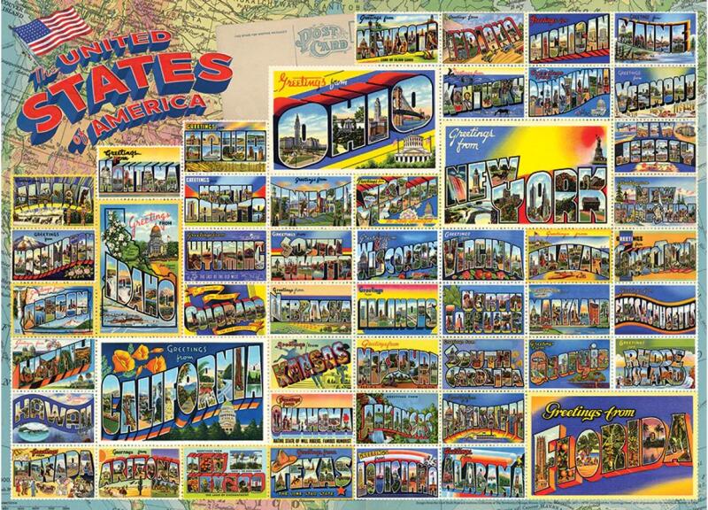 A kanadai Cobble Hill a nosztalgikus, színes, és mindemellett kiváló minőségű kirakókkal kívánja örvendetessé tenni a játék élményt kicsiknek és nagyoknak egyaránt. A Cobble Hill 1000 db-os puzzle - Vintage American Postcards című képen csodálatos amerikai kolázs képeslapok láthatóak.
