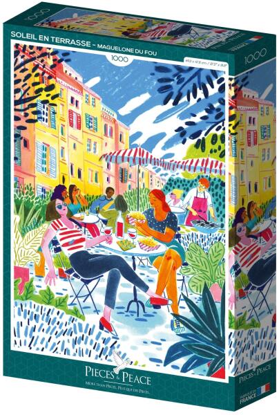1000 darabos kirakó . Márka: Pieces & Peace Művész: Maguelone du Fou Kirakott kép méret: 47.8 x 69 cm Doboz méret: 35,5 x 24 x 5,5 cm Eredeti cím: Sun on the terrace GTIN: 3770001401027