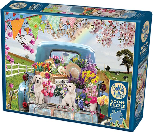 A kanadai Cobble Hil l a nosztalgikus, színes, és mindemellett kiváló minőségű kirakókkal kívánja örvendetessé tenni a játék élményt kicsiknek és nagyoknak egyaránt. A Country Truck in Spring - 500 db-os kirakón egy igazi tavaszi, színekkel teli kép található. Tele van gyönyörű virágokkal és imádni való kutyusokkal. A puzzle vidám hangulata magával ragadja a kirakó