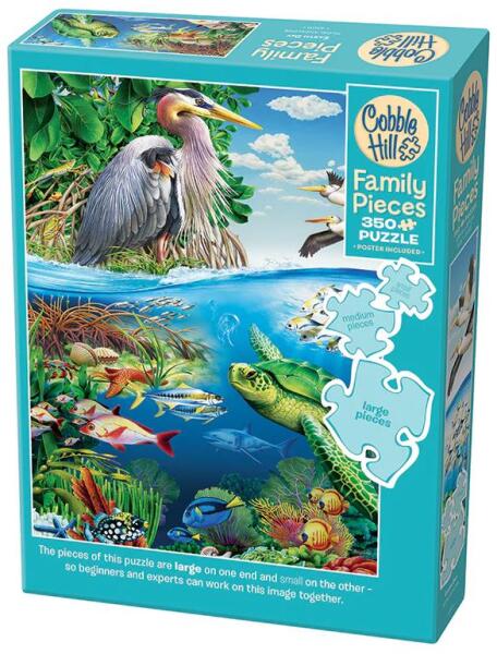 A kanadai Cobble Hill a nosztalgikus, színes, és mindemellett kiváló minőségű kirakókkal kívánja örvendetessé tenni a játék élményt kicsiknek és nagyoknak egyaránt. A Cobble Hill 350 db-os puzzle - Earth Day Ez a szárazföld és a tenger ebben a színes Föld napja Family Pieces 350 puzzle-ben! Élvezze a halak között úszó tengeri teknőst, majd forduljon az ég felé a gyö