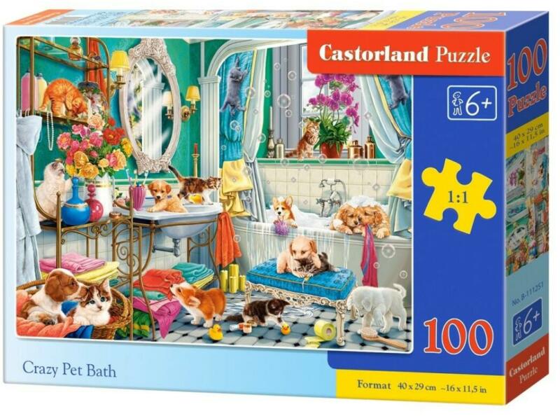 A Castorland kirakók sokszínűségükről ismertek és igen széles választékban kaphatóak. Hagyományos képi témáik mellett különlegesebb, városokat és nevezetességeket ábrázoló kirakókat is találunk kínálatukban. A Castorland 100 db-os puzzle - Crazy Pet Bath című képen cuki kisállatok felfordítják a fürdőszobában.