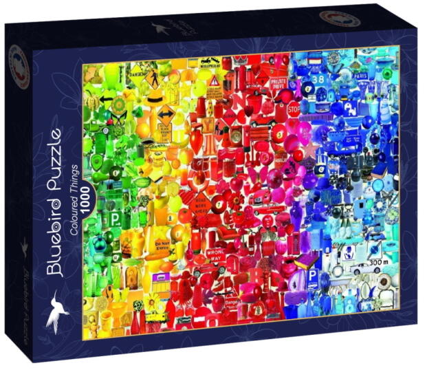 A francia Bluebird 2019 óta van jelen a kirakók világpiacán. Magas minőségű, környezettudatos technológiával készült, mégis megfizethető áron elérhető puzzle képei közt elsősorban művészi alkotások találhatók. Az 1000 db-os Bluebird - Coloured Things puzzle képén a német Barbara Behr formatervező egyik alkotása látható, melyen a szivárvány minden színében pompá