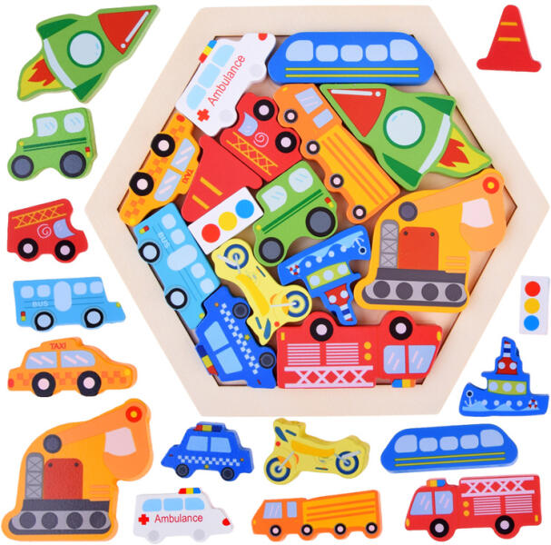 A szállítójárművek formájú fából készült puzzle különféle történetek összeállítására, eljátszására és kitalálására szolgál, és mindazoknak, akik szeretik az autókat és mindent, ami körülöttük van. A járművek egy fa alapra vannak helyezve, ami megkönnyíti a tárolást a játék után. Az egész játék fából készült, a járművek a rendeltetésnek megfele