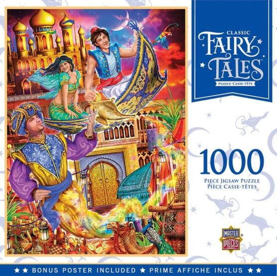 Az amerikai MasterPieces Puzzle Company gyönyörű és részletgazdag kirakókat gyárt különféle stílusokban és darabszámokban. A cég több világhírű márkával együttműködve az innováció és magas minőség mellett nagy gondot fordít az újrahasznosításra is. A MasterPieces 1000 db-os puzzle - Aladdin című képen a meséből jól ismert Aladdin, Jázmin és a varázslatos Dz