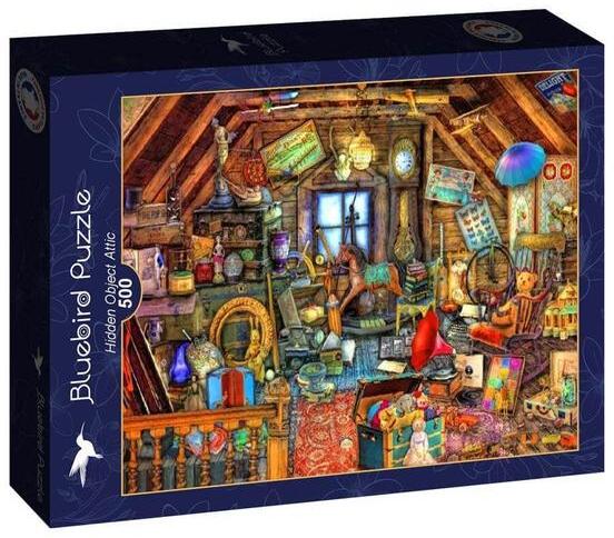 A francia Bluebird 2019 óta van jelen a kirakók világpiacán. Magas minőségű, környezettudatos technológiával készült, mégis megfizethető áron elérhető puzzle képei közt elsősorban művészi alkotások találhatók. Az 500 db-os Bluebird puzzle - Hidden Object Attic című képén egy tárgyakkal telezsúfolt padlást láthatunk. A kép Aimee Stewart alkotása, tele van apró fe