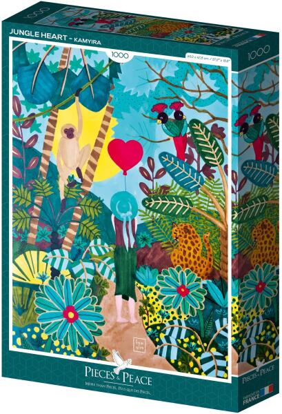 1000 darabos kirakó . Márka: Pieces & Peace Művész: Kamyira Kirakott kép méret: 69 x 47,8 cm Doboz méret: 35,5 x 24 x 5,5 cm Eredeti cím: Jungle Heart GTIN: 3770001400792