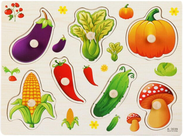RAKTÁRRÓL AZONNAL! Fogantyús készségfejlesztő fa puzzle - Zöldségek Ezzel az aranyos, fa ki-berakó fogantyús kirakó val a kisebb gyerkőcök megismerhetik a kerti zöldségek et. A színes képeket érdekesnek fogják találni a gyerekek, ráadásul logikus gondolkodásuk és finommotorikus készségük is fejlődni fog, ugyanis a feladat, hogy a különböző zöldség formákat, a meg