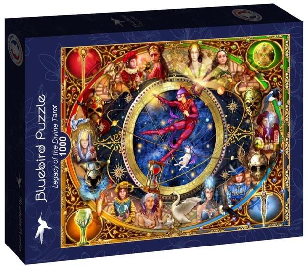 A francia Bluebird 2019 óta van jelen a kirakók világpiacán. Magas minőségű, környezettudatos technológiával készült, mégis megfizethető áron elérhető puzzle képei közt elsősorban művészi alkotások találhatók. Az 1000 db-os Bluebird puzzle - Legacy of the Divine Tarot című képén az olasz származású művész, Marchetti Ciro 78 db-os tarot paklijának egyik kártyalap