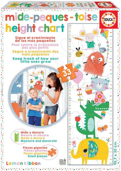 Puzzle Meter Lemon Ribbon minőségi képkirakó a spanyol Educa vállalat műhelyéből és különböző vidám állatkák ábrájával lett kivitelezve. A puzzle 33 darabos , az összeillesztett darabok 96*30 cm ábrát alkotnak meg. Az összeillesztett képkirakó Fix ragasztóval összeragasztható. Az összeillesztett puzzle oldalán méter található, igy a kis lurkók megtudják mérni, h