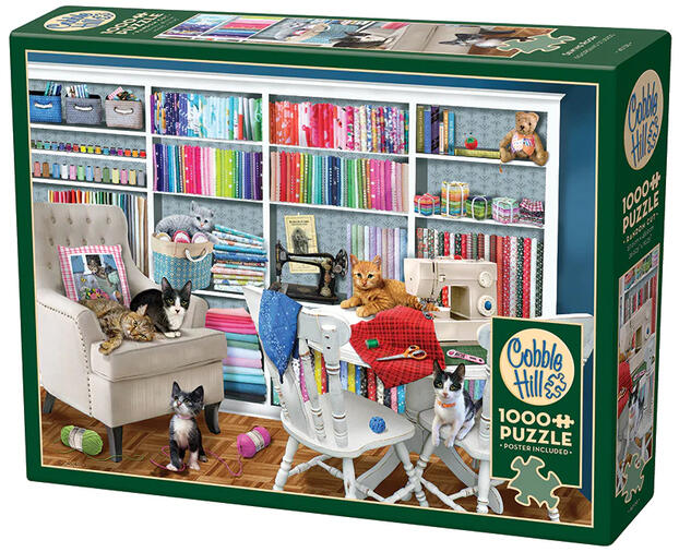 A kanadai Cobble Hill a nosztalgikus, színes, és mindemellett kiváló minőségű kirakókkal kívánja örvendetessé tenni a játék élményt kicsiknek és nagyoknak egyaránt. A Cobble Hill 1000 db-os puzzle - Sewing Room című képen egy szobában látható kiscicák pihennek a kanapén.