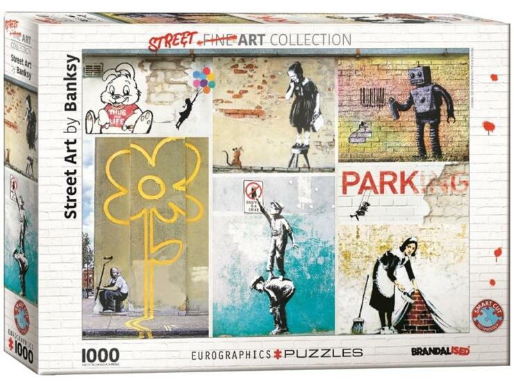 Az EuroGraphics 1000 db-os puzzle - Fine Art Collection - Street Art by Banksy című képen a személyazonosságát titkoló brit graffitiművész néhány művét csodálhatjuk meg. Az EuroGraphics gyártó nagy figyelmet fordít a környezettudatos működésre, úgy a termékeik előállításánál, mint a dolgozóik környezetbarát gondolkodásra való ösztönzésénél. Az új technológi