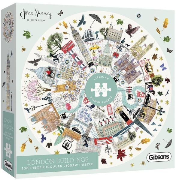 500 darabos kirakó Kör alakú kirakó Márka: Gibsons Művész: Josie Shenoy Kirakott kép méret: 49 cm átmérő Doboz méret: 20,5 x 20,5 x 5 cm Eredeti cím: London Buildings (500 Circular) GTIN: 5012269037005