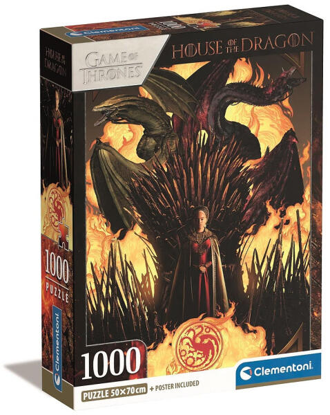 Az olasz Clementoni kirakók kiváló minőségű, strapabíró darabokból készülnek, a puzzle széles választékban kapható minden korosztályt megcélozva. Clementoni 1000 db-os puzzle COMPACT puzzle - Game of Thrones - House of the Dragon kirakó képén a Trónok harca - Sárkányok háza sorozat ikonikus figuráit láthatjuk. A COMPACT kiadású 1000 darabos puzzle kirakott képe a már