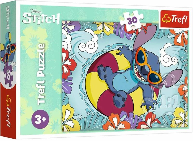 Trefl Lilo&Stitch Napozó Stitch Puzzle -30 darabos A gyerekek egy cuki, Lilo&Stitch témájú képet rakhatnak ki a Trefl puzzle segítségével. Ez a 30 darabos puzzle kifejezetten a kicsi kezekre lett tervezve, így a darabok mérete jelentősen nagyobb a megszokottnál, ami megkönnyíti a kicsik számára a kirakást. Jellemzők és előnyök: Magas minőségű anyag: A puzzle darabok