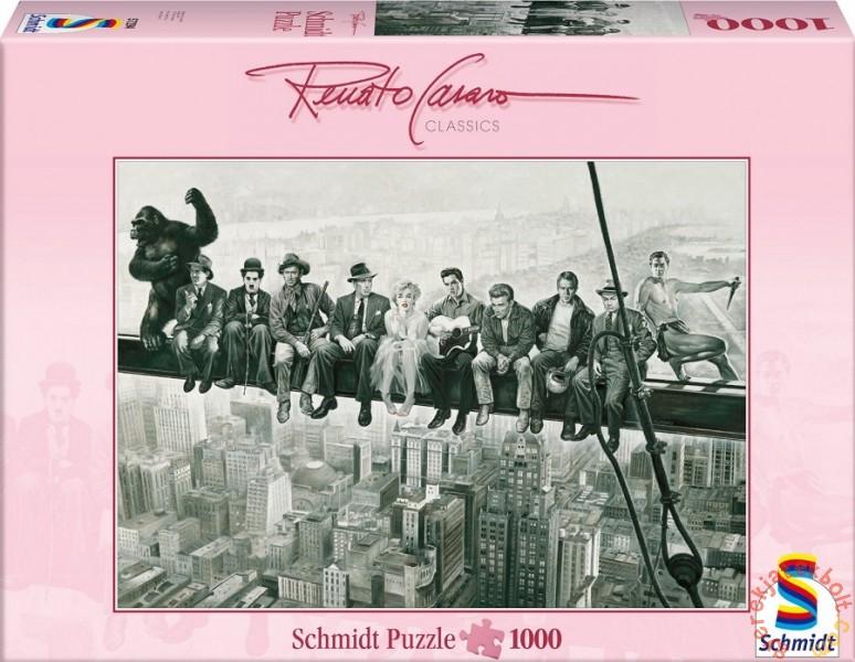 Schmidt - kiváló minőségű, német gyártmányú, 1000 darabos, fekete-fehér festmény puzzle. A klasszikus New York építése - ebédszünet képen, Renato Casaro olasz származású filmplakát festő művész, Hollywood-i hírességekkel cserélte le az eredeti kép építőmunkásait. A jól ismert német precizitásnak, a szerkesztés és a vágás pontosságának köszönhetően biztos