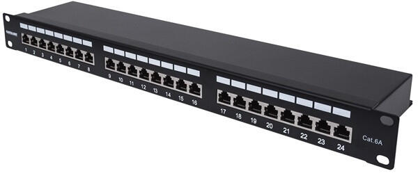 Manhattan Patch panel - CAT6A FTP árnyékolt patch panel, 24 portos, 1U, Fekete Solid and reliable terminations for copper cable, featuring a minimum of 3-micron gold-plated jack contacts Top-entry punch-down blocks simplify installation Compatible with Krone punch-down tools Supports 22 to 24 AWG stranded and solid wire For use with fully shielded twisted pair (FTP) Cat6a network cable Ideal for