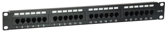 Equip Patch panel - 235325 (24 port, Cat5e, 1U, árnyékolatlan, fekete) 235325 24-Port Cat. 5e Unshielded Patch Panel, Black Model Number 235325 SKU 235325 24 Ports x Cat. 5e RJ45 Unshielded Class D, up tp 100MHz, 10/100Base-T, 1GBase-T Compliant with ANSI/TIA/EIA 568 standard IDC T568A/T568B Color Coded Dual IDC (LSA and 110) compatible 19", 1U Material: Strudy Steel Color: Black (RAL 9005) The
