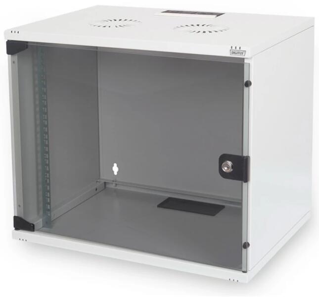7U wall mounting cabinet, SOHO, unmounted 370x540x400 mm, full glass front door, grey. - Safety class rating IP20 - Lockable safety-glass door - 200° door opening angle - 1-point-locking-mechanism...