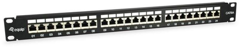 Termék részletek326625 24-Port Cat. 6A Shielded Patch Panel, Black Model Number 326625 SKU 326625 24 Ports x Cat. 6A RJ45 Shielded Class EA, up to 500MHz, 10GBase-T ISO/IEC 11801 and EN 50173 Compliant with ANSI/TIA/EIA 568 standard IDC T568A/T568B Color Coded Dual IDC (LSA and 110) compatible 19", 1U Material: Strudy Steel Color: Black (RAL 9005) The equip® Patch Panel is a 19" 1U network distribution unit int