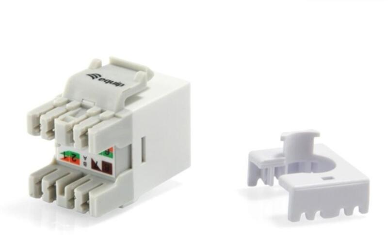 769213 Cat. 6 Unshielded Keystone Jack LSA, Slim Type, White, 8pcs/pack Model Number 769213 SKU 769213 Gold Flash Contact Cable Wire Gauge: 23AWG ~ 26AWG LSA Connector IDC T568A/T568B Color Coded Class E according to ISO/IEC 11801 and EN50173 Unshielded Selling unit: 8pcs/pack The equip® Keystone Jack is the essential component for a reliable cabling system. Composed of preeminent materials, the