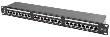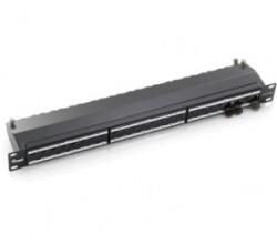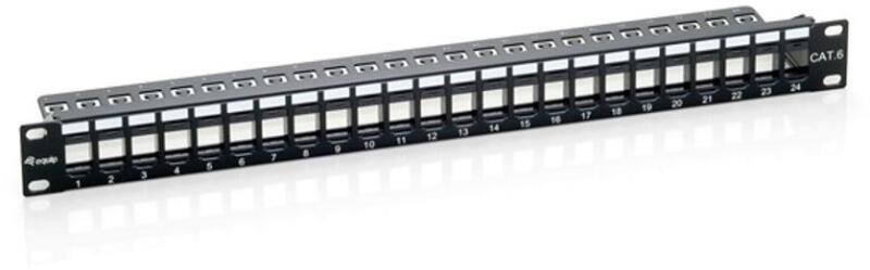 Termék részletek769224 24-Port Keystone Cat. 6 Unshielded Patch Panel, Black Model Number 769224 SKU 769224 19", 1U 24 Port x Keystone Cat. 6 Unshielded Snap-in mounting Including support bar Material: Sturdy Steel Color: Black (RAL 9005) The equip® Patch Panel is a 19" 1U network distribution unit integrating cable management system for better routing and strain relief requirements, suitable for both LSA and 1