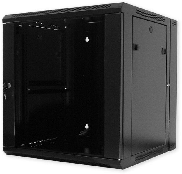 19 "-os falra szerelhető adatszekrény üvegajtóval, összeszerelve. A kapcsolótábla két részre van osztva. A hátsó 10 cm -es rész a falhoz van rögzítve, és maga a kapcsolótábla csuklópántokkal elfordítható a faltól. Ennek a megoldásnak az előnye, hogy kényelmesen hozzáférhet a vezetékek fali aljzatához, és könnyen felszerelheti a készüléket a kapcsolótáblába. Mas