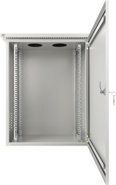 IP55 védettségű Szélesség: 600 Mélység: 600 Magassság: 12U Teherbírás 100Kg IP55 védelemmel Kültéri Lemez első ajtó Kábelkivezetés: alsó, Szellőzés kialakítás oldalt, felül RAL7035 szürke színben A szekrény a hátsó raszter sínt nem tartalmazza!