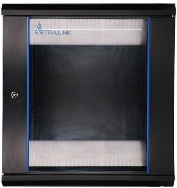 EXTRALINK 4U 10" rack cabinet The Extralink rack cabinet is designed for wall mounting in offices, network server rooms and CCTV control rooms. The external walls are made of cold-rolled steel sheet, while the front door has a tempered glass pane with the possibility of opening to the left or right side. Clearly marked cabinet height The vertical rails have a corresponding height designation which