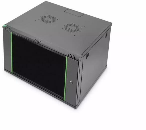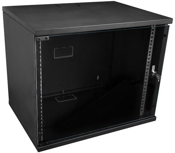 9U wall mounting cabinet 505x600x600 mm, color black (RAL 9005). - Safety class rating IP20 - Lockable safety-glass door with steel frame - 210° door opening angle - 1-point-locking-mechanism on t...
