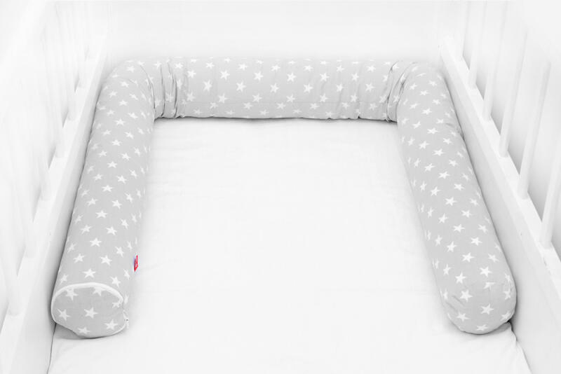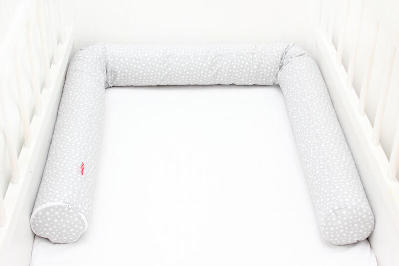Rácsvédő hengerpárna, szürke-fehér, csillagos mintával. A rácsvédő hengerpárnákat többféle méretben gyártjuk: 150 cm, 180 cm, 210 cm, 300 cm. Illetve a három darabos változatot: 3×60 cm, 3×70 cm. A hengerpárnák átmérője: 11-12 cm A méret kiválasztása után frissül az ár! Anyaga: Huzat: 100% pamutvászon, OEKO-TEX minősítéssel, a hátoldalára rávasalva egy vetex r