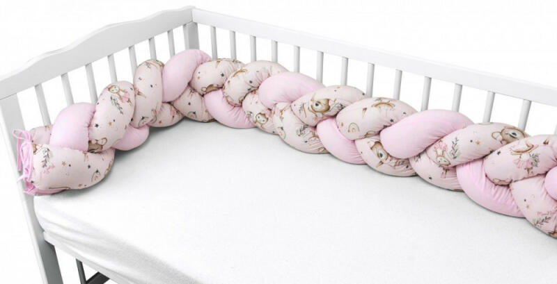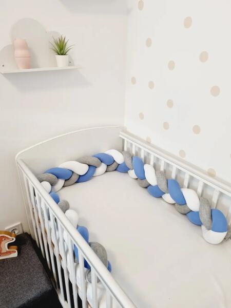 Kiváló minőségű anyagokból készült dizájn kiságyvédő. A fonott védő nagyon puha, és használható a kiságyban, fészekként vagy a kanapén. A védő pamutszövetből készült, a töltelék antiallergén szilikonszál. Hossza kb. 360 cm, magassága kb. 15 cm, vastagsága kb. 6 cm. A fonat kézzel varrott. Ha más méretű vagy színű protektor érdekli, kérjük, forduljon hozzá