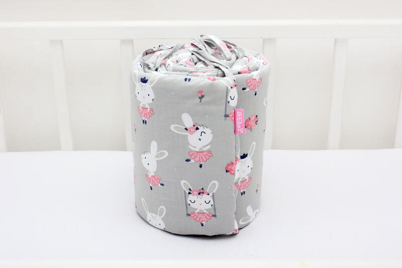 Scamp rácsvédő, balerina nyuszis mintával. Méretek: Hosszúság: 180 cm vagy 210 cm (választható) Magasság: 21 cm Anyagösszetétel: Külső huzat: 100% pamutvászon, töltet: PES vlies Összesen 12 kötözővel készül a biztonságos rögzítés érdekében. Mosógépben mosható, vasalása nem ajánlott.
