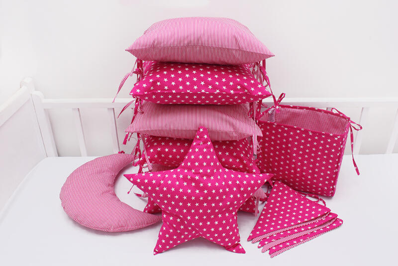 Rácsvédő párna szett kiságyba + vászon girland + vászon tárolókosár + formapárnák. Összesen 6 db rácsvédő párna: 3 db pink alapon fehér csillagos és 3 db pink-fehér csíkos. + 1 db vászon girland, ugyanolyan színekben + 1 db vászon tárolókosár, pink alapon fehér csillagos. + 1 db csillag: pink alapon, fehér csillagos + 1 db félhold: pink-fehér csíkos . Párnák mére