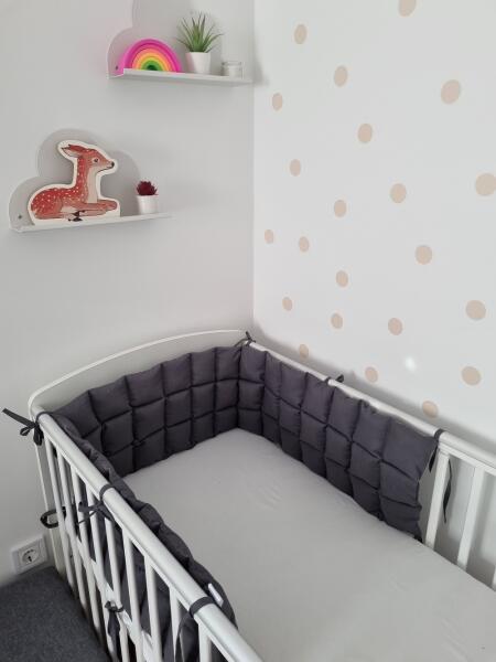 Divatos és praktikus rácsvédő kiságyba Belisima Mr. Grey. Puha, kényelmes anyagból készült. Anyaga: belső oldal: 100% pamut. Töltet: 100% poliészter. Az ágyhoz szallagokkal rőgzíthető. Mérete: kb. 180x33 cm. Ezek a termékek biztonságosak, mivel: a természetes pamut nem okoz bőrirritációt, mivel nem tartalmaz formaldehidet és egyéb, csecsemőkre káros anyagokat. Nem veszí