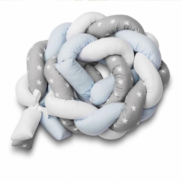 Fonott rácsvédő kiságyba Sensillo, puha és kellemes tapintású. Pamutból és antiallergén szilikon töltőanyagból készült. Minden végén szalag található, hogy a copfot a kiságyhoz lehessen rögzíteni. A rögzítéssel biztosítja gyermekének a biztonságos és egészséges alvást. A copf felhasználható babafészekként, vagy dekorációként a szobába, esetleg mint egy szige