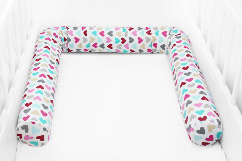Rácsvédő hengerpárna, színes, szives mintával. A rácsvédő hengerpárnákat többféle méretben gyártjuk: 150 cm, 180 cm, 210 cm, 300 cm. Illetve a három darabos változatot: 3×60 cm, 3×70 cm. A hengerpárnák átmérője: 11-12 cm A méret kiválasztása után frissül az ár! Anyaga: Huzat: 100% pamutvászon, OEKO-TEX minősítéssel, a hátoldalára rávasalva egy vetex réteg, ami
