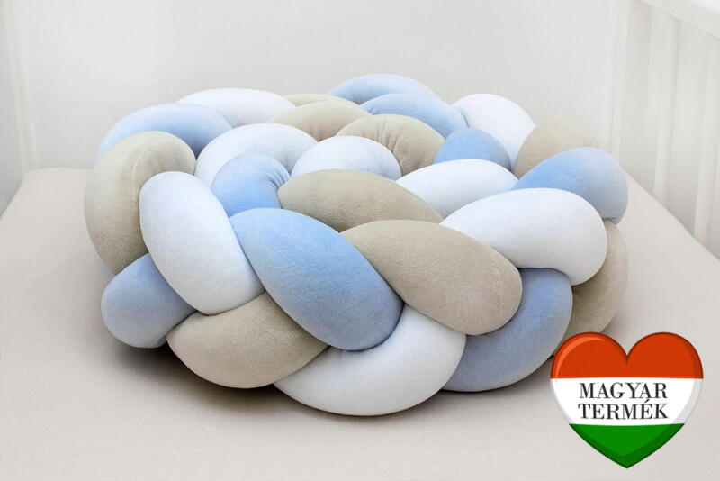 Fonott rácsvédő, fehér-bézs-kék színben. Alapanyag: - Huzat: 80% pamut, 20% PES bébiplüss - Töltet: 100% szilikonizált poliészter Mindkét alapanyag Oeko-tex minősítésű. . A fonott rácsvédők mosógépben moshatók, kímélő programon: 30-40 fokon. A végeket érdemes mosásnál rögzíteni (biztosítótűvel), hogy ne jöjjenek szét. Szárítógépes szárítás, és vegyi tis
