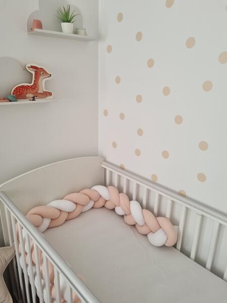 Gyönyörű, nagyon puha fonott gyermekágyba való rácsvédő, 100% pamutból. Rúdhoz rögzíthető. A rácsvédő megvédi a baba kezét és lábáta rácsok közöttielakadástól , valamint a csecsemő fejét és testéta kiságy falához való ütközés ellen. A mellékelt pamut kötőkkel a fészek rögzíthető a rudakhoz. A normál rácsvédőkkel összehasonlítva ez lehetővé teszi a