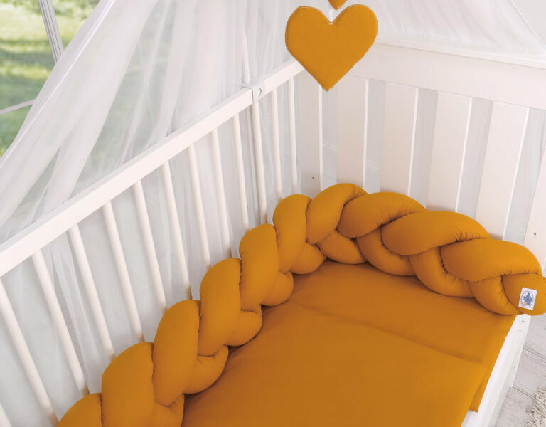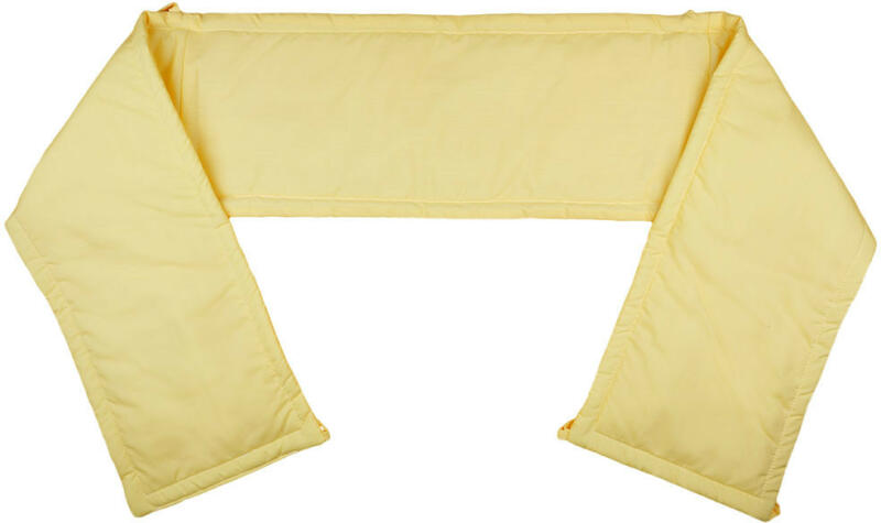 Fejvédőnkkel biztonságban tudhatja kisbabáját az alvás idején. A 180x25cm-es méret tökéletesen illeszkedik a 60 cm-es babaágyhoz. Különleges dizájnja és sárga színű kivitele bájos kiegészítője lesz a gyermekszobának. A fejvédő minimum 25 cm, maximum 36 cm magasságúra állítható, így a kisbaba növekedésével is használható lesz. A fejvédő 100% pamut anyagból ké