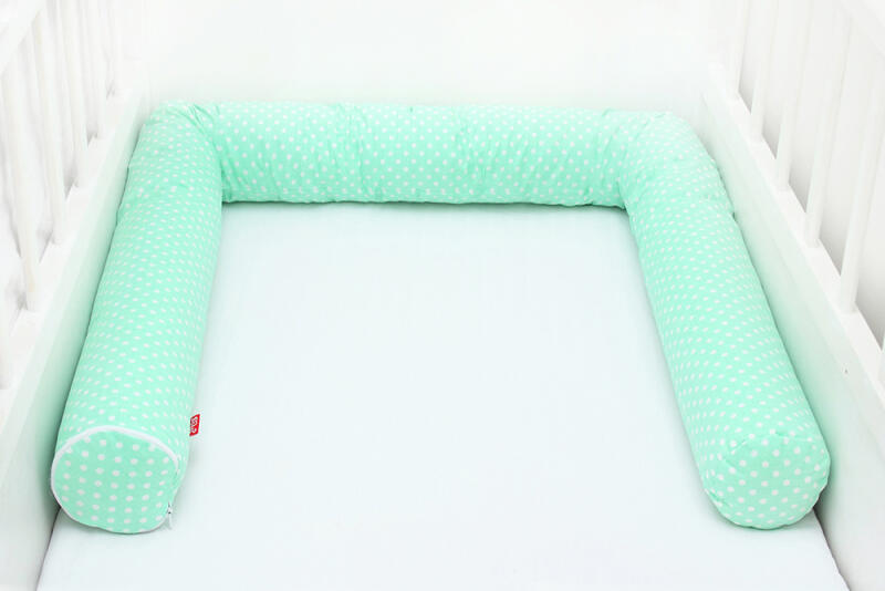 Rácsvédő hengerpárna, zöld-fehér, pöttyös mintával. A rácsvédő hengerpárnákat többféle méretben gyártjuk: 150 cm, 180 cm, 210 cm, 300 cm. Illetve a három darabos változatot: 3×60 cm, 3×70 cm. A hengerpárnák átmérője: 11-12 cm A méret kiválasztása után frissül az ár! Anyaga: Huzat: 100% pamutvászon, OEKO-TEX minősítéssel, a hátoldalára rávasalva egy vetex ré