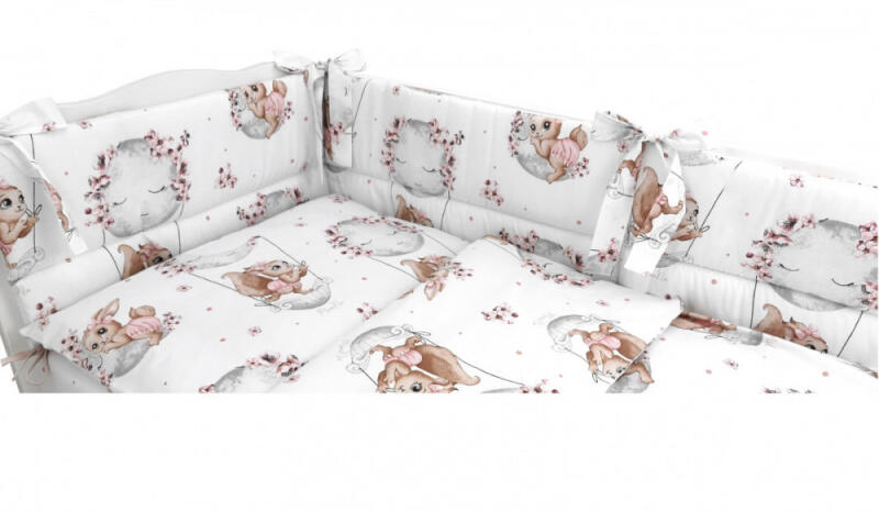 2 részből álló rácsvédő szett. Méretei: - takaró 120 x 150 cm - kiságy rácsvédő 55 cm + 60 cm + 55 cm, magassága 40 cm Anyagösszetétel: 100% poliészter