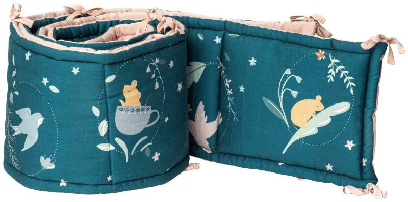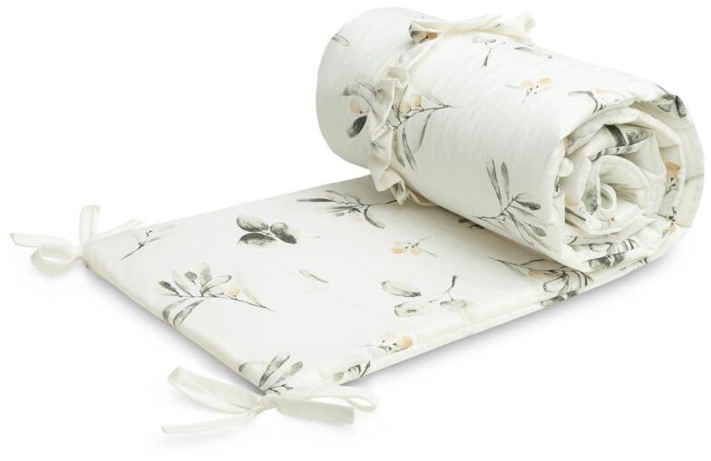A rácsvédő bármilyen szabványos kiságyhoz illeszkedik. Gyönyörű anyagok és bevarrt fodrok jellemzik, melyek egyedivé varázsolják a babaszobát. A termék puha pamutból készült, csodaszép díszes motívum nyomattal. A puha töltet megóvja a gyermeket a sérülésektől, amikor a kiságyban mozog. A fejvédő megfelelő pozícióban tartását sűrűn varrott szalagok biztosítják