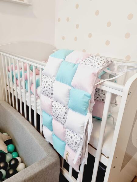 Gyönyörű, nagyon puha fonott rácsvédő100% pamutból. Rácsokhoz rögzíthető. A rácsvédő megvédi a baba kezét és lábát attól, hogy beszoruljon a rácsok közé, valamint megóvja a baba fejét és testét a kiságy falához való ütközéstől. Sok szín közül lehet választani. Meg fogja találni a szobájához illőt. Mérete: 360cm