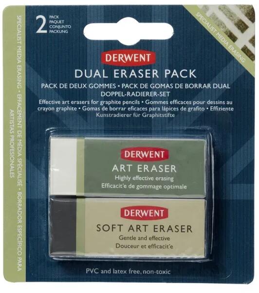 Derwent vinil radír, fekete és fehér, 2 db/szettKettős radírcsomag A művészeti (art eraser) radír általános többcélú és mindenfajta ceruzához használható, míg a puha (soft art eraser) puhább radír verzió. Széntartalma miatt lehetővé teszi a puha finom radírozást, amellyel kevesebb kárt tesz a papirban.