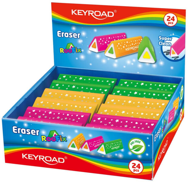 RADÍR PVC MENTES 24DB/DISPLAY KEYROAD ROOFIX VEGYES SZÍNEK „Nád a házam teteje, ergonomikus a radírom egésze. 3 élénk színkombináció (rózsaszín-narancs, zöld-sárga, narancs-zöld), a szín nem választható vonzó kialakítás PVC mentes 24 db/display