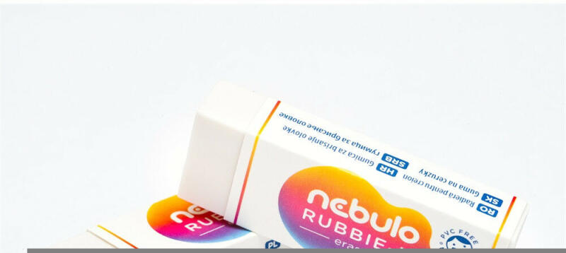Nebulo Rubbie minőségi gumi radírok papír tokban. Ideálisak ceruzavonalak radírozásához. PVC mentesek, nem tartalmaznak egészségre káros anyagot. A radír forgácsmentes anyagból készül, így a radírozás során a forgács nem hullik apró darabokra, ezzel biztosítva a tisztább, foltmentes munkát. Rubbie-M mérete: 59*21*11 mm Katalóguskód: 27168 RADÍR, RUBBIE-M, NEBULO Gyárt