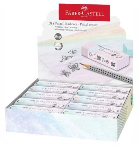 Kiváló minőségű egyfuvolú radír, grafit ceruzához és zsírkrétához 4 pasztell színben. gumi mérete: 60 x 22 x 12 mm nem hagy csíkokat, kevesebb hulladékot gumírozáskor, a törmelék összegördül nem tartalmaz PVC-t és ftalátokat színek: korall, lila, zöld, kék válassza ki a színváltozatot az árcédula feletti mezőben A csomag 20 db gumit tartalmaz. Az ár 1 db-ra vonat
